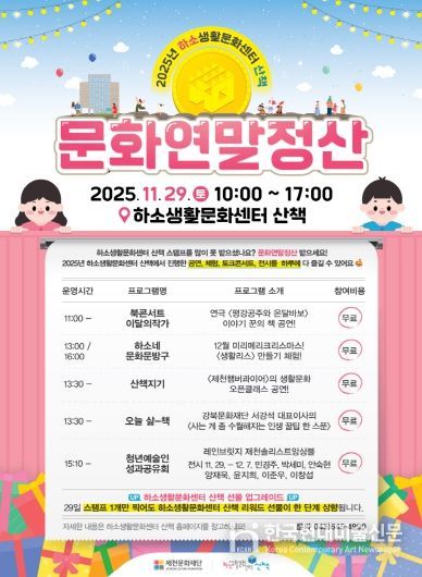 제천문화재단 관계자는 “하소생활문화센터 산책이 올 한 해 시민과 함께 쌓아온 책, 예술, 생활문화의 기록을 한날에 돌아보는 자리가 바로 이번 문화연말정산”이라며, “아이부터 어르신까지 각자의 방식으로 한 해를 정리하고 새해를 준비하는 따뜻한 문화 시간이 되길 바라며, 앞으로도 시민 일상 가까이에서 문화가 숨 쉬는 산책을 만들어 가겠다”고 말했다.