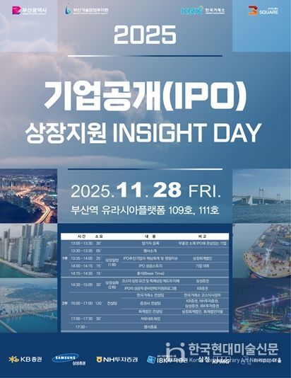 한국현대미술신문 정소영 기자 | 부산시와 부산기술창업투자원은 한국거래소와 함께 28일 오후 1시 부산역 유라시아플랫폼에서 지역에서 처음으로 '2025년 기업공개(IPO, Initial Public Offering) 상장 지원 인사이트 데이(INSIGHT DAY)'를 개최한다고 밝혔다.