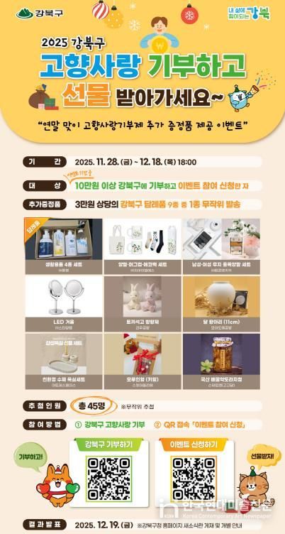 한국현대미술신문 배건 기자 | 서울 강북구는 연말을 맞아 고향사랑기부제에 참여한 기부자들을 대상으로 특별 이벤트를 진행한다고 밝혔다.