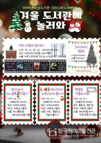한국현대미술신문 정소영 기자 | 사상도서관은 다가오는 크리스마스를 맞아 12월 한 달 동안 도서관 전체를 겨울 콘셉트로 꾸민 ‘겨울도서관’을 운영하며 지역 주민을 위한 다양한 전시·체험 프로그램을 선보인다.