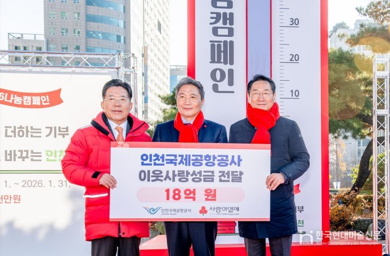한국현대미술신문 박재남 기자 | 인천국제공항공사(사장 이학재)는 1일 오후 인천광역시청 앞 애뜰광장에서 진행된 ‘희망 2026 나눔 캠페인’출범식에 참여해 인천사회복지공동모금회(회장 조상범)에 지역 사회공헌 성금 18억 원을 전달했다고 밝혔다.