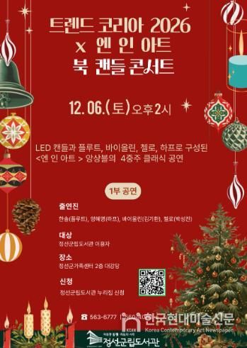 한국현대미술신문 원진 기자 | 정선군립도서관은 오는 12월 6일 오후 2시, 정선군 가족센터 2층 대강당에서 ‘트렌드 코리아 2026 × 엔 인 아트 북 캔들 콘서트’를 개최한다고 2일 밝혔다.