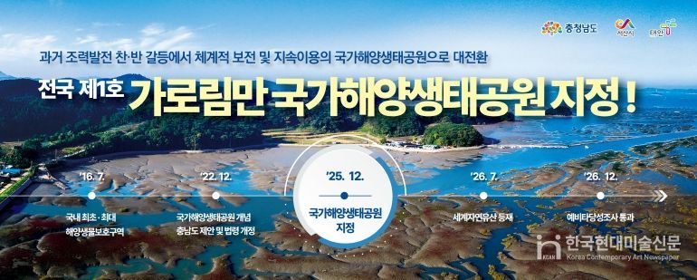 한국현대미술신문 신정은 기자 | 충남도는 세계 5대 갯벌이자 전국 최초·최대 해양생물보호구역인 가로림만이 ‘제1호 국가해양생태공원’으로 지정됐다고 2일 밝혔다.