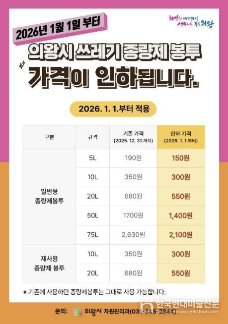 한국현대미술신문 배윤섭 기자 | 의왕시가 물가 상승 및 경기 침체로 인한 시민들의 경제적 부담을 완화하기 위해 2026년 1월 1일부터 쓰레기 종량제봉투 판매가격을 인하한다.