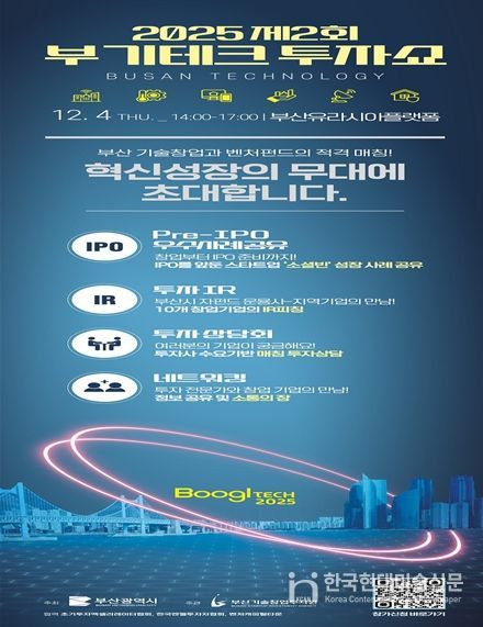 한국현대미술신문 정소영 기자 | 부산시는 오늘(4일) 오후 2시 부산역 유라시아플랫폼에서 '2025년 제2회 부기테크 투자쇼'(이하 행사)를 개최한다고 밝혔다.