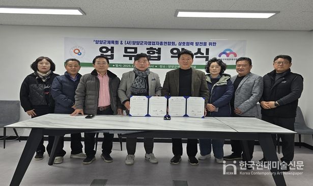한국현대미술신문 원진 기자 | 양양군체육회와 (사)양양군자영업자총연합회는 지난 12월 3일에 지역 경제와 체육의 상호 시너지 효과를 높이기 위한 업무협약을 체결했다.