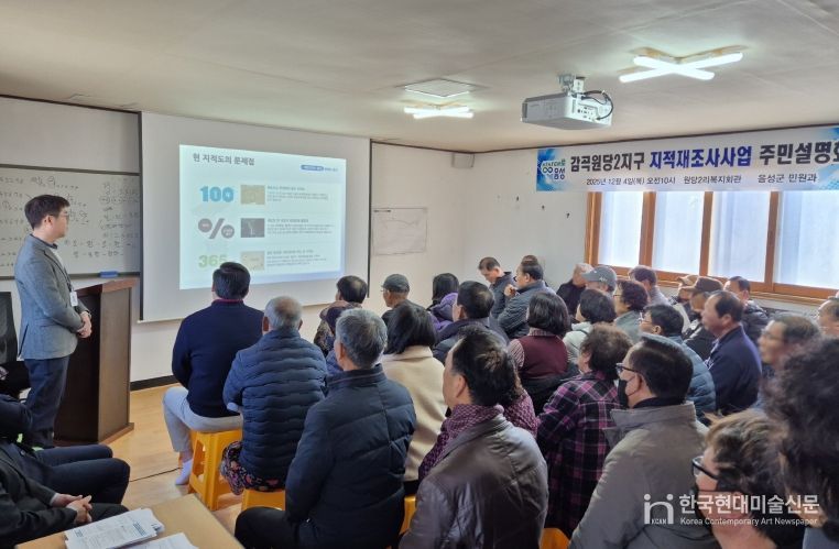 한국현대미술신문 신정은 기자 | 음성군은 4일 감곡면 원당2리 복지회관에서 2026년도 591필지(75만5146㎡) 감곡원당2지구 지적재조사사업에 대한 주민설명회를 개최했다.