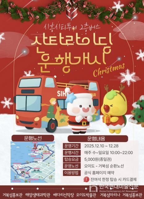 한국현대미술신문 배윤섭 기자 | 시흥시는 연말을 맞아 오이도~거북섬을 순환하는 2층 버스에 크리스마스 테마를 적용한 특별 운행 ‘산타라이딩’을 12월 10일부터 운영한다. 이번 테마 운행은 겨울철 해양 관광 활성화와 연말 분위기 조성을 위해 조성을 위해 마련된 것으로, 12월 28일까지 운행되며 상황에 따라 기간은 연장될 수 있다.
