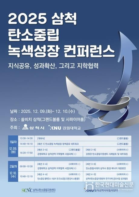 한국현대미술신문 원진 기자 | 삼척시와 강원대학교가 공동 주최하는 ‘2025 삼척 탄소중립 녹색성장 컨퍼런스’가 오는 12월 9일부터 10일까지 이틀간 쏠비치 삼척에서 개최된다.