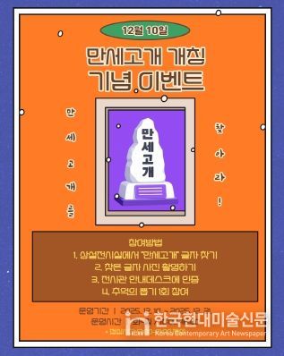 한국현대미술신문 배윤섭 기자 | 안성3.1운동기념관은 오는 12월 10일부터 12월 31일까지 만세고개 개칭을 기념한 시민 참여형 이벤트 “만세고개를 찾아라!”를 운영한다.