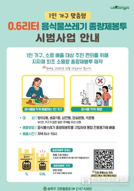 한국현대미술신문 배건 기자 | 서울 송파구가 전국 지방자치단체 최초로 1인 가구에 최적화된 0.6ℓ 규격의 음식물쓰레기 종량제봉투를 오는 10일부터 시범 도입해 운영한다고 알렸다.