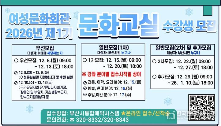 한국현대미술신문 정소영 기자 | 부산시 여성문화회관은 오는 내일(8일)부터 '2026년 제1기 문화교실' 수강생을 모집한다고 밝혔다.