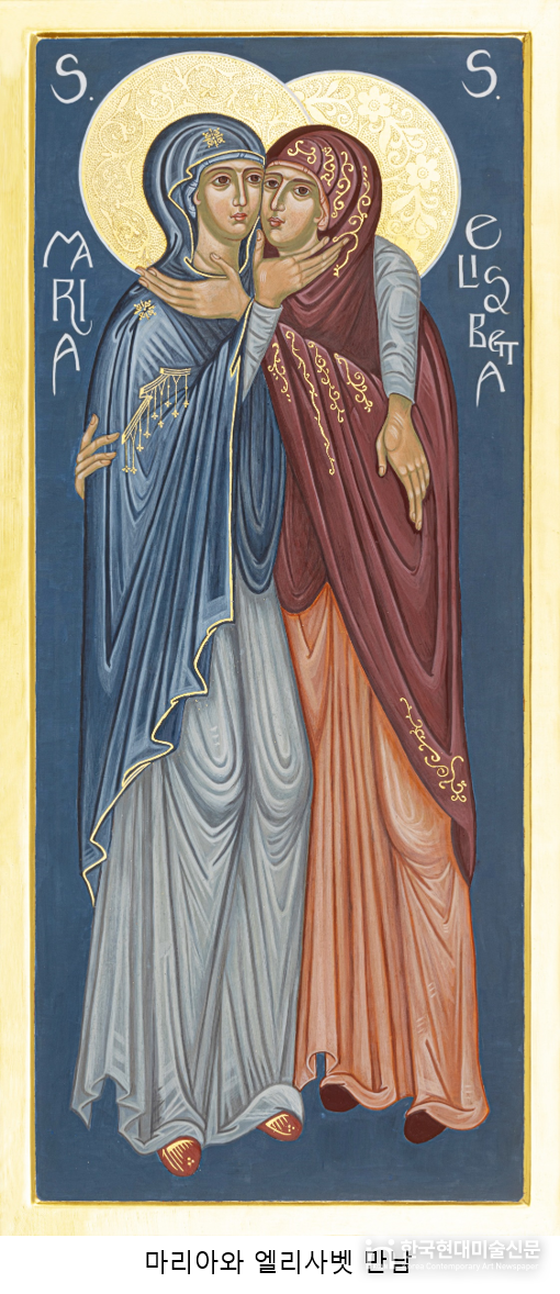 "마리아와 엘리사벳 만남"은 성모 마리아와 엘리사벳이 서로를 포옹하는 순간을 담고 있다. 마리아는 하느님의 말씀을 품고 엘리사벳을 찾아갔고, 엘리사벳은 성령의 감동으로 마리아를 알아보며 기쁨으로 맞이한다. 둘의 포옹은 단순한 인사가 아니라, 하느님께서 시작하신 새로운 생명을 함께 기뻐하는 믿음의 만남을 상징한다.