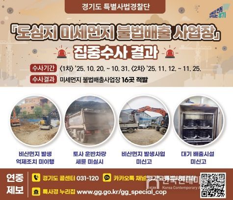 한국현대미술신문 배윤섭 기자 | 경기도는 도심지 미세먼지 발생사업장 330개를 대상으로 불법 배출 행위를 집중 수사해 대기환경보전법 위반 사업장 16개를 적발했다고 9일 밝혔다.