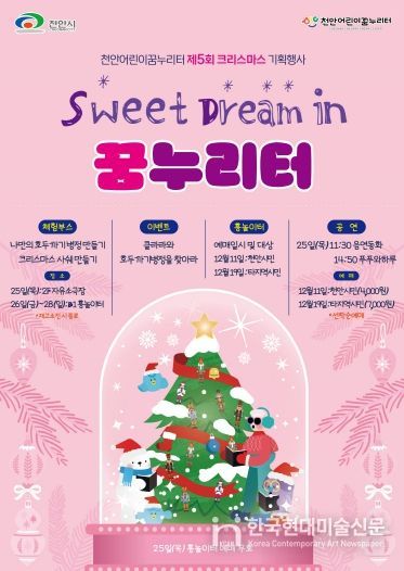 한국현대미술신문 신정은 기자 | 천안어린이꿈누리터(관장 조삼혁)는 오는 12월 25일부터 28일까지 제5회 크리스마스 기획행사‘Sweet Dream in 꿈누리터’를 진행한다고 밝혔다.