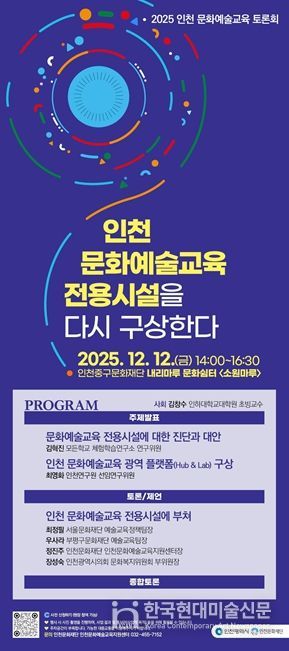 한국현대미술신문 박재남 기자 | (재)인천문화재단은 오는 12월 12일 14시, 인천중구문화재단 내리마루 문화쉼터에서 '2025 인천 문화예술교육 토론회' “인천 문화예술교육 전용시설을 다시 구상한다”를 개최한다.