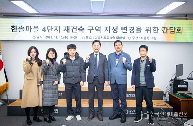 한국현대미술신문 배윤섭 기자 | 성남시의회 더불어민주당 최종성 의원(분당,수내3,정자2·3,구미)은 12월 10일 성남시의회 5층 회의실에서 ‘한솔마을 4단지 재건축 구역 지정 변경 간담회’를 개최했다고 밝혔다.