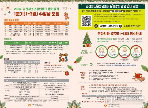한국현대미술신문 배윤섭 기자 | 수원시청소년청년재단 권선청소년청년센터는 오는 1월 6일부터 3월 27일까지 지역사회 평생학습 문화강좌 1분기(1~3월) 수강생을 모집한다.