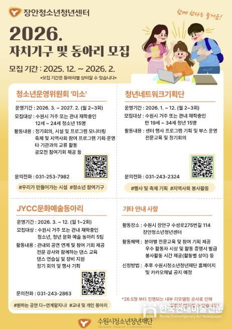 한국현대미술신문 배윤섭 기자 | 수원시청소년청년재단 장안청소년청년센터는 2025년 12월 16일부터 청소년 수련시설 및 지역사회의 변화를 이끌어갈 청소년과 청년 지원자를 모집한다.