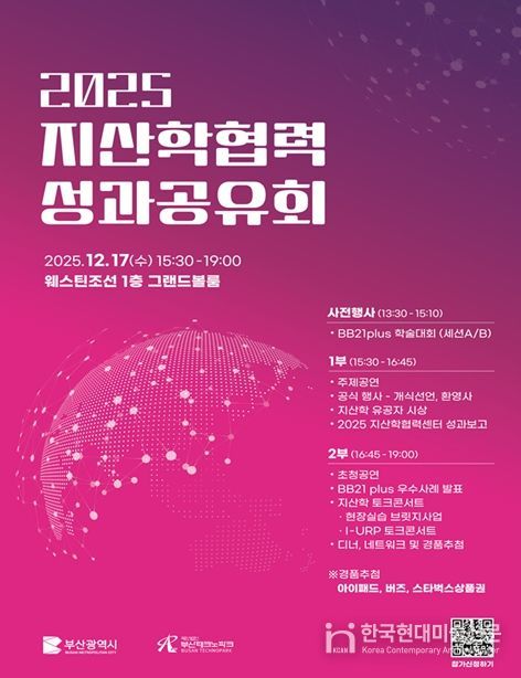 한국현대미술신문 정소영 기자 | 부산시는 오늘(17일) 오후 3시 30분 웨스틴조선호텔에서 '2025 지산학협력 성과공유회'를 개최한다고 밝혔다.