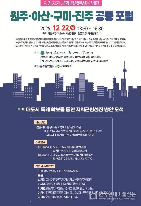 한국현대미술신문 원진 기자 | 원주·아산·구미·진주시는 오는 12.22. 14:00에 국회의원회관 제2소회의실에서 지방자치 균형성장발전을 위한 ‘원주·아산·구미·진주 공동 포럼’을 개최한다.