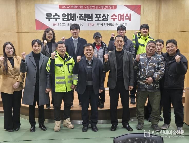 한국현대미술신문 원진 기자 | 원주시는 12월 16일 '2025년 생활폐기물 수집ㆍ운반 대행업체 평가결과'에 따른 우수등급 업체 및 소속 직원을 대상으로 원주시장 상장 및 표창장을 수여한다.