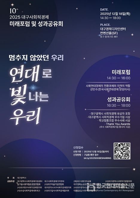 한국현대미술신문 정소영 기자 | 대구광역시와 대구사회적경제지원센터는 12월 18일 오후 2시 30분, 대구경북디자인센터 컨벤션홀에서 지역 사회적경제 기업인 및 유관 단체 관계자 등 120여 명이 참석한 가운데 ‘2025 대구 사회적경제 미래포럼 및 성과공유회’를 개최했다.