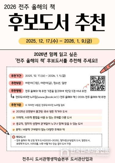 시는 내년 1월 9일까지 ‘2026 전주 올해의 책’ 후보도서 시민 추천을 접수한다고 19일 밝혔다.