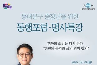 한국현대미술신문 배건 기자 | 서울 동대문구가 중장년의 ‘인생 2막’ 설계를 돕기 위한 공개 포럼과 특강을 연다. 동대문구는 29일 오후 1시 30분 구청 2층 다목적강당에서 ‘동대문50플러스센터 동행포럼·명사특강’을 개최한다고 밝혔다. 2026년 상반기 개관을 앞둔 동대문50플러스센터의 운영 방향을 주민과 공유하고, 지역 여건에 맞는 프로그램을 함께 모색하기 위한 자리다.