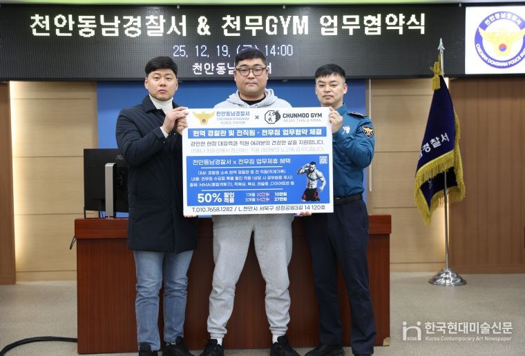 한국현대미술신문 신정은 기자 | 천안 동남경찰서(서장 송해영)는 2025년 12월 19일(금) 오후 2시, 천안동남경찰서 중회의실에서 무에타이·MMA 전문 체육관인 ‘천무짐’(관장 문보람)과 ‘경찰관 체력 증진 및 복지 향상’을 위한 업무협약(MOU)을 체결했다고 밝혔다.