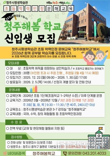 한국현대미술신문 신정은 기자 | 청주시는 초등학력 취득을 희망하는 성인 학습자를 위한 학력 인정 문해교육 프로그램 ‘청주해봄학교’의 2026학년도 신입생을 모집한다고 20일 밝혔다.