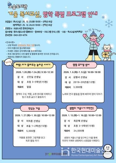 한국현대미술신문 신정은 기자 | 청주오송도서관 권역 내 7개관(오송·서원·흥덕·신율봉·강내·옥산·가로수)은 겨울방학을 맞아 독서교실 및 방학 특별프로그램 수강생을 모집한다.