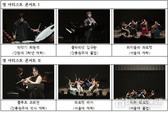 ‘영 아티스트 콘서트’는 강원도 내 음악대학 출신의 우수 인재와 대관령아카데미 시즌 교육프로그램인 ‘실내악 멘토십 프로그램’에 참여한 실력 있는 실내악 팀들이 무대에 올랐다.