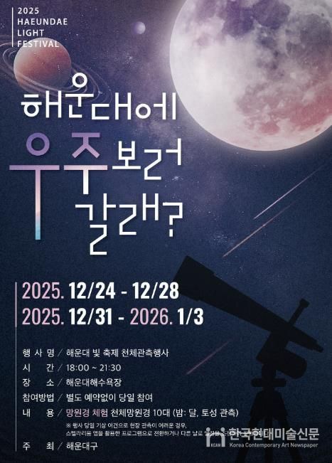 한국현대미술신문 정소영 기자 | 해운대구가 해운대빛축제 특별 이벤트 ‘우주 보러 갈래’를 12월 24~28일, 12월 31일~1월 3일에 운영한다.