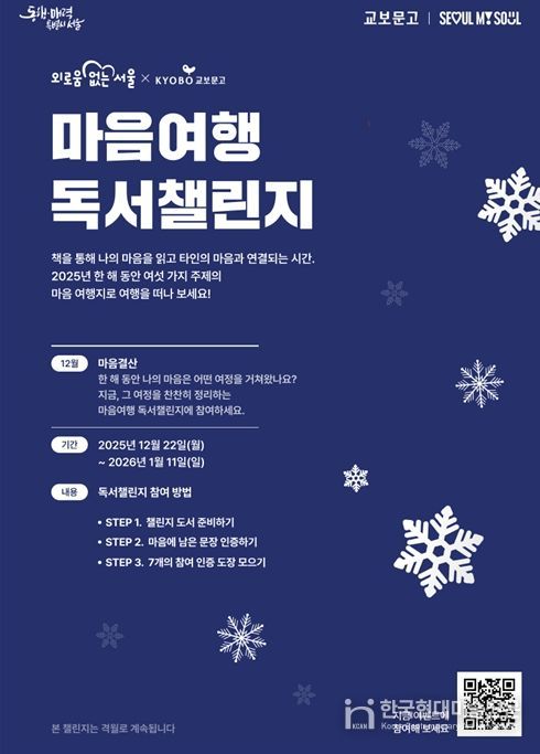 한국현대미술신문 배건 기자 | 서울시가 ‘외로움 없는 서울’을 만들기 위한 노력의 일환으로 교보문고와 함께 여섯 번째 ‘마음여행 독서챌린지’를 진행한다. 이번 챌린지는 ‘마음결산’을 주제로, 올해 나의 마음을 움직인 책과 그 속에서 기억에 남는 문장을 선택해 ‘2025 마음결산 리포트’를 완성하며 한 해의 여정을 마무리한다.