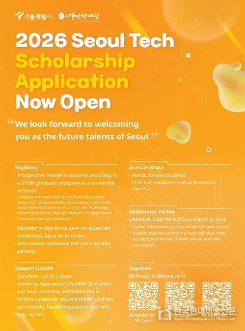 한국현대미술신문 배건 기자 | 서울장학재단이 기존 개발도상국 중심이던 지원 자격을 국적 제한 없이 전면 개방하고, '2026년 서울테크스칼러십(Seoul Tech Scholarship)' 장학생 30명을 선발한다. 서울의 미래 산업을 이끌 글로벌 이공계 우수 인재를 서울로 적극 유치하기 위한 전략이다.