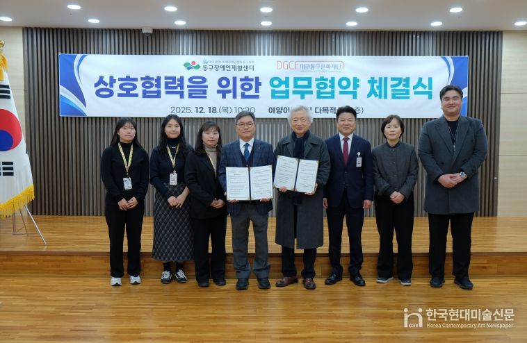 한국현대미술신문 정소영 기자 | (재)대구동구문화재단(이사장 윤석준)과 동구장애인재활센터(센터장 이종근)는 지난 12월 18일, 지역 장애인의 건강증진과 생활체육 활성화를 위한 업무협약(MOU)을 체결했다.