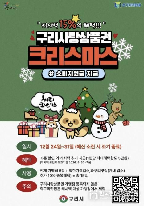 한국현대미술신문 배윤섭 기자 | 구리시는 12월 24일부터 ‘구리사랑상품권 크리스마스 소비 지원금’을 지급한다고 밝혔다. 이번 소비 지원금은 연말연시 기간 지역 외로 유출되는 소비를 지역 내로 유도하고, 관내 상권 활성화와 소상공인 보호를 위해 마련됐으며, 예산 소진 시 조기 종료될 수 있다.