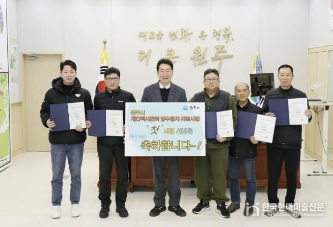 한국현대미술신문 원진 기자 | 원주시는 올해 신규사업으로 추진한 개인택시 면허 양수 융자지원 사업 첫 지원자 5명을 선정하고, 22일 원주시장 집무실에서 축하 인사를 전했다.