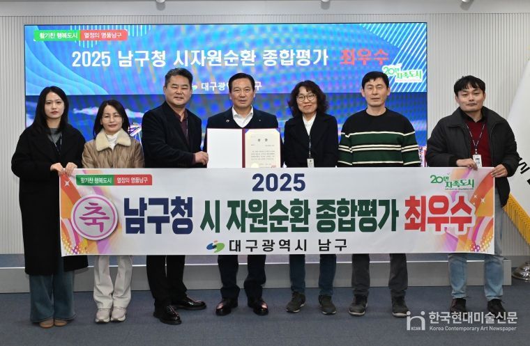 한국현대미술신문 정소영 기자 | 대구 남구는 2025 대구시 자원순환행정 종합평가에서 9개 구·군 가운데 ‘최우수’(1위)를 차지하며, 자원순환 선도 도시 명품 남구의 위엄을 알렸다.