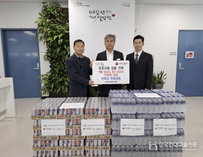 한국현대미술신문 배윤섭 기자 | 천원궁 천원교회 권순구 교구장 외 임원진은 최근 가평군 설악면 행정복지센터를 방문에 이웃돕기 성품으로 맥콜 30상자와 생수 30상자를 기탁했다.