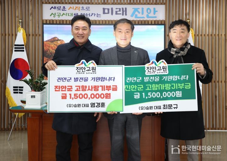 한국현대미술신문 기자 | 22일 (유)승원 염경훈·최문규 공동대표가 진안군을 방문하여 고향사랑기부금 3백만원을 기탁했다.