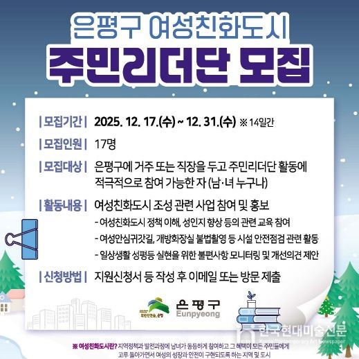 한국현대미술신문 배건 기자 | 서울 은평구는 여성친화도시 조성을 위해 함께 할 ‘여성친화도시 주민리더단’ 단원을 새로 모집한다고 밝혔다.
