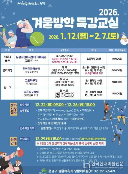 한국현대미술신문 배건 기자 | 서울 은평구는 겨울방학을 맞아 청소년들의 건강증진과 건전한 여가 활동을 지원하기 위해 ‘2026년 청소년 겨울방학 생활체육 특강교실’을 운영한다고 밝혔다.