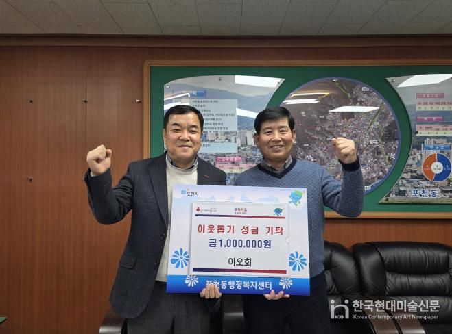 한국현대미술신문 배윤섭 기자 | 포천동 행정복지센터는 지난 22일 이오회가 포천동 내 어려운 이웃을 돕기 위해 성금 100만 원을 기탁했다고 밝혔다.