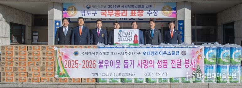 한국현대미술신문 정소영 기자 | 국제라이온스협회 355-A지구 제4지역 오대양 라이온스클럽(회장 이문근)은 지난 12월 22일 회원들과 함께 영도구를 방문하여 이웃돕기 성품으로 라면 100박스와 휴지 100팩(300만 원 상당)을 기탁하며 지역사회에 따뜻함을 더했다.