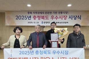 영동전통시장상인회는 23일 충북상인연합회 주관으로 충북상인연합회 회의실에서 열린 2025년 충청북도 우수 전통시장 시상식에서 최우수시장 인증패와 시상금 720만 원을 받았다.