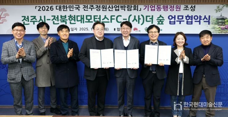 전주시와 전북현대모터스FC(단장 이도현), 사단법인 더숲(대표 정명운)은 23일 시청 3층 소회의실에서 ‘2026 대한민국 전주정원산업박람회’ 기업동행정원 조성을 위한 업무협약을 체결했다.