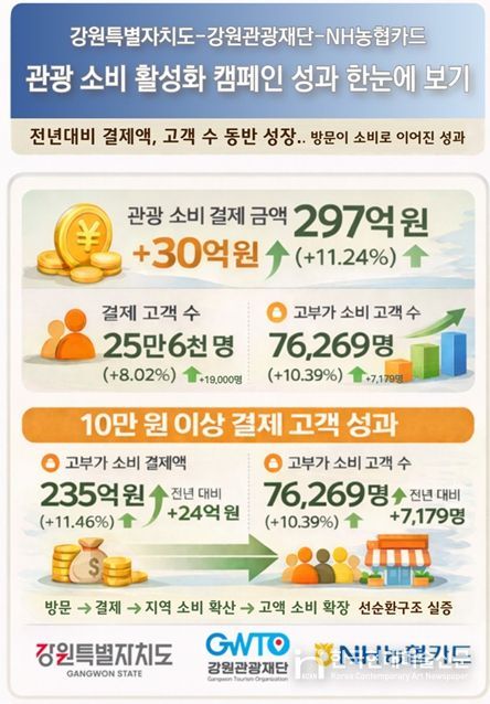 한국현대미술신문 원진 기자 | 강원특별자치도와 강원관광재단은 NH농협카드와 함께 추진한 ‘강원 관광소비 활성화 상생 캠페인’ 결과, 전년 동일 기간 대비 관광 소비 금액과 결제 고객 수가 모두 증가하며 실질적인 지역 소비 활성화 성과를 거둔 것으로 나타났다.