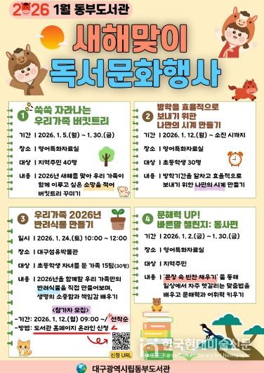 한국현대미술신문 정소영 기자 | 대구동부도서관은 다가오는 새해를 맞아 지역주민이 도서관에서 뜻깊은 한 해를 시작할 수 있도록 1월 한 달간 동부도서관 ‘새해맞이 특별 독서문화행사’를 운영한다.